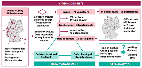 To gather useful data to address our research questions, we conducted a citizen science project with horse farms in Germany following the model for developing citizen science projects proposed by Bonney et al. [1]. The study was designed to assess the effects of grazing system, average daily time on pasture, horse type and husbandry system on locomotion of domestic horses on pasture. Two grazing systems (continuous and rotational stocking), two classes of average daily time on pasture (2–8 h, > 8 h) and two horse types (cold-blooded and warm-blooded type, following Langlois (1994) [32]) were to be distinguished. Husbandry systems were classified into box-stall stables, free-ranging stables (i.e., active stables, paddock trails) and pasture only. The aim was to select 40 horse farmers to achieve a balanced dataset concerning these four design variables. GPS telemetry of two horses per farm was to be recorded for five days on the same pasture.