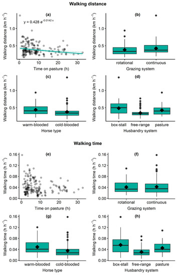 Effect of time on pasture, grazing system, horse type and horse husbandry system on walking distance (a–f) and walking time (e–h) of horses on pasture. (a): scatterplot of raw data and model prediction with 95% confidence interval; (b–d,f–h): boxplots and means (diamond) of raw data. Sample size: 167 GPS records from 56 horses on 28 farms.