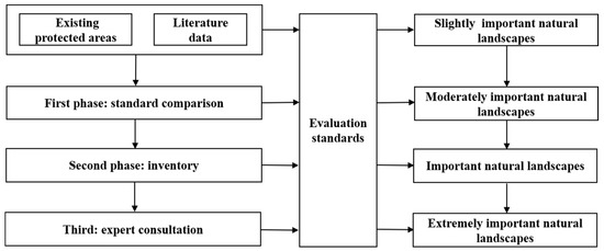 Grading evaluation process for natural landscapes in China. According to the evaluation criteria, natural landscapes were evaluated and selected from a low to a high level, using existing protected areas and literature data as the main landscape sources. We separated moderately important natural landscapes and level above from slightly important natural landscapes according to the standard comparison method, separated important natural landscapes and level above from moderately important natural landscapes according to the inventory method, and separated extremely important natural landscapes from important natural landscapes according to the expert consultation method.