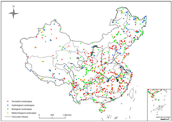 Terrestrial landscapes mainly included mountains, deserts, canyons, Danxia landforms, karsts, volcanoes, natural relics, coasts, and islands. Of them, mountain landscapes were mainly distributed along China’s main mountain ranges, desert landscapes were mainly in arid and semi-arid areas in northwestern China, and canyon landscapes were mainly along large mountains and rivers. Danxia landscapes were mainly distributed along the southeastern coast, central–southern China, parts of northwestern China, karst landscapes in Guangxi, Guizhou, Yunnan, and Chongqing in southwestern China, and volcanic landscapes mainly in Heilongjiang, Jilin, Yunnan, and Hainan. Besides, two types of natural relic landscapes (i.e., geological and paleontological relics) were relatively scattered, and coasts and islands were distributed along China’s southeastern coastal areas.
