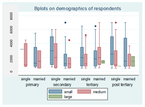 According to Figure 2, households with primary education, but with small to medium family size had lower income (ZAR4000 or less, 1ZAR = 0.05USD). Yet, households with secondary education had over ZAR5000–6000 in terms of income level. Although a medium-sized household (single) had a high income (ZAR2000–4000) compared to a small-medium household (married) who had around ZAR2000–2500. On the other hand, households with a tertiary level education had a monthly income below ZAR4000 for both the single and married. Additionally, those with a large married household had the lowest income (less than ZAR2000). Lastly, small households with post-tertiary level education had an income ranging between ZAR4000–6000 monthly. One thing that can be noted is that small sized households had more income and bigger households as well as the lowest income monthly. The major reason for this is that, as the household gets smaller in terms of family size, their propensity to save is greatly enhanced. However, when the household has a large family size, their propensity to consume increases.