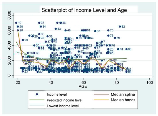 A scatter plot was done on income distribution and age. Figure 3 shows that most households had a monthly income that was less than ZAR2000, even though some had close to ZAR4000. The scatter plot shows that most of the respondents were more than 40 years of age. The income distribution was a reflection of the current situation in a number of rural areas in South Africa where most households rely on government grants. This is the case in South Africa, especially in the Eastern Cape Province, as pointed out by Cheteni et al. [19], Cheteni [20], DAFF [21] and Taruvinga et al. [11] with regard to income dynamics in rural areas.