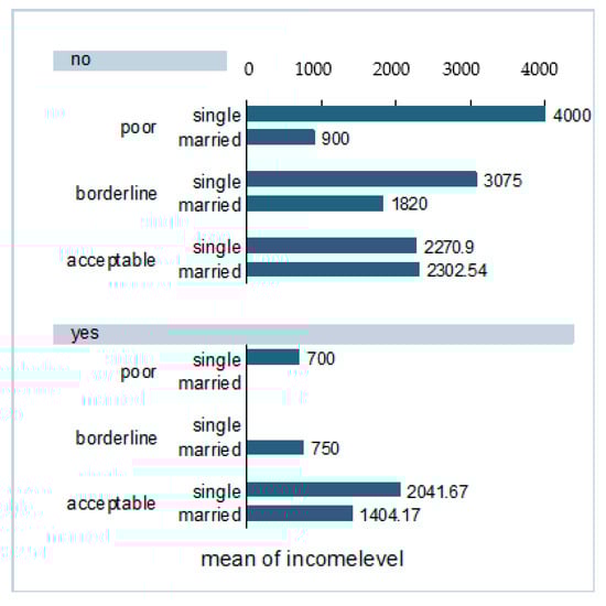 According to Figure 4, households were grouped into three classes’ known as poor, borderline, and acceptable based on their Household Food Consumption Score (HFCS). Households classified as ‘no’ were not participating in a government food security program and the ones under ‘yes’ were participating in a government food program. Non-participating households in food security programs regarded as poor (HFCS) and single had the largest income mean of ZAR4000. However, those falling on the borderline (HFCS) and single had ZAR3075 mean income. However, those at the acceptable (HFCS) range were at an income level of about ZAR2270–2302 for both the single and married. Based on this finding, it can be concluded that single households on the poor-borderline (HFCS) bandwidth had more income. As a result, they might not have seen the need to participate in food security programs. On the other hand, households who were participating in food security programs were mostly at acceptable (HFCS) levels in terms of food security, with both single and married people having a mean income of around ZAR1400–2050. Therefore, we can safely conclude that households participating in food security programs ate more food groups compared to the non-participating. However, in terms of income levels, households who were not participating in food security programs had more income.