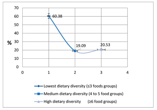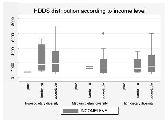 Figure 5 shows that 60 percent of households fell into the lower dietary diversity group, 19 percent are in the medium dietary diversity group, and 21 percent are in the high dietary diversity group. Most households consumed 3 food groups, which include milk, cereals, and pulses. The mean average of the HDDS was 3, which possibly reveals that most households were not consuming many food groups. Lower dietary households consuming 3 food groups were regarded as food insecure, households consuming 3–5 food groups were moderately food secure, and those consuming more than 6 food groups were food secure. The results clearly point out that households in the study area had poor dietary diversity, which is one of the major contributors of stunted growth in children. The USAID [23] points out that the HDDS gives an indication of food groups consumed by households in the last 24 h. As a result, it should not be used as a nutrition indicator but rather an indicator of food access. A study conducted by Taruvinga et al. [11] in the Eastern Cape in two local districts found that food groups such as sugar, condiments, oils, grains, and potatoes were dominant. However, this study finds dissimilar results in different local villages, even though the same conclusion of low dietary diversity by Taruvinga et al. [11] holds in this study. As stated before, this might have been influenced by the geographic location of the households. Areas with inadequate rainfall mainly rely on starch food such as maize, potatoes, and other foods compared to areas with high rainfall, where households can have a variety of food groups. However, this study finds similar results to Taruvinga et al. [11] on low dietary diversity regardless of geographic location. Basically, this shows that geographic location has a minimum impact on influencing household dietary diversity. An HDDS distribution chart, according to income level, was done in order to assess how income affects food security and household dietary diversity.
