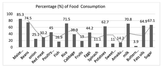 The average HDDS score indicated that, on average, each household consumes three food groups out of the eight food groups available, which signifies a lower dietary diversity in their access to food. Maize was the most consumed food (85%) by households because it is found in mealie meal, porridge, and pap. Secondly, 75 percent of the respondents had consumed beans in the last seven days, as well as rice (71%). Respondents stated that beans are usually eaten as a complementary product with rice or pap, and it is very cheap. As a result, most households usually consume it. Besides the mentioned food, potatoes, fat oil, sugar, milk, and poultry were some of the consumed food items. FAO [24] stated that, in developing countries, low dietary diversity is a norm because of challenges faced by households such as poverty and unemployment. Given that most households surveyed were doing subsistence farming, the FAO [24] observations hold in this case. Nonetheless, households surveyed stated that they usually eat what is available, or anything from their farms or gardens, and anything affordable. Moreover, they pointed out that dietary diversity is not a prime concern when buying food. As a result, obesity is a norm around the study areas due to the food being eaten by households.