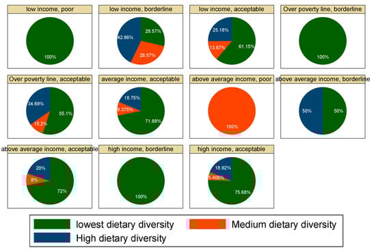 According to Figure 8, low income and higher income households had poor food consumption levels. However, in terms of dietary diversity, the above income households were on the medium dietary level. On the other hand, high income and over the poverty line households were on the borderline level in terms of the food consumption level. Yet, they were regarded as being on the low dietary level. In terms of an acceptable food consumption level, households with above average income had, at most, low dietary diversity. Succinctly, most households had low dietary diversity with the exception of the above average income households who had poor food consumption levels but with medium dietary diversity. It can be concluded that the sampled population had low dietary diversity, even though they had borderline to acceptable food consumption levels regardless of their income.