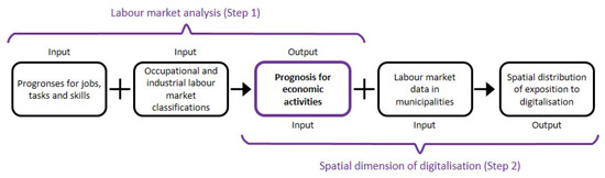 Spatial planning science is a discipline that refers to and connects elements from other specialist fields in order to explore the complex interrelationships within the analysed spatial systems, e.g., states, regions, or municipalities. To assess the exposition of the labour market to digitalisation the following steps are carried out: (1) desk research concerning literature review and data analysis on possible changes of the labour market due to digitalisation. Current projections of the labour market development in the coming decades are explored. Detailed information on classification systems of the labour market and economy necessary to project selected estimations on the statistical data of the Austrian labour market are set for the second step. (2) The input information on possible developments of the labour market due to digitalisation is translated to the classification system of the statistical data and linked with the employee census on the municipal level (see Figure 1).