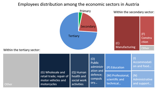 Before proceeding with the analyses, the current situation of the Austrian economy, the labour market, its innovation and adaptation potential as well as spatial characteristics of the municipalities are shortly introduced. Of the 8.8 million people living in Austria [52], 4.3 million are employed, of which 53% are male and 47% female (2017). The economic activity rate is 76.6% (2018), the share of part-time employees who are actively employed has been increasing for some years and is now 31.2%. The unemployment rate is 4.9% (2018) and shows a slightly downward trend [53,54]. The employees are distributed among the economic sectors as follows (see Figure 2): primary sector 3.3%, secondary sector 22.5%, tertiary sector 73.4%. Using the NACE 2008 industry standard classification, the following economic sections dominate the secondary sector: manufacturing (NACE Code C) with the share of 64% and construction (F) with 31%. In the tertiary sector, 21% are employed in wholesale and retail trade, repair of motor vehicles and motorcycles (G); 13% in human health and social work activities (Q); 10% in public administration and defence, compulsory social security (O); 9% in education (P); 9% in professional, scientific and technical activities (M); 8% in accommodation and food service activities (I); 8% in administrative and support service activities (N) [54].