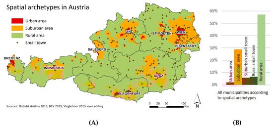 Spatial (A) and proportional (B) distribution of spatial archetypes in Austria.