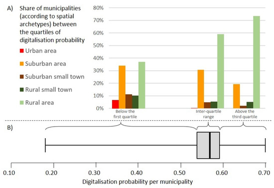 (A) Share of municipalities by spatial archetype below the 25th percentile, in the interquartile range, and above the 75th percentile. (B) Digitalisation probability per municipality.