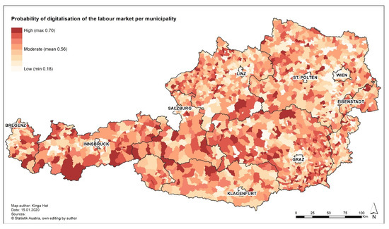 - Municipalities with or without an established business and private sector may be able to adjust, actively reshape, and profit from the structure of regional industry and service sectors. Independent of location, it can mean an increase of life quality and more opportunities available in the associated regions. If the municipality is big enough to have a diversified labour market it still can be resilient to digitalisation transformation as the high exposure can be balanced by apposite diversity. The time needed for adaptation to the new situation can therefore be bridged, many different qualifications already exist in the community, openness for innovation is easier as the human resources are on site [38,74]. Most probably at the beginning only a limited group could profit from the restructured economic activity but if the community is able to activate endogenous circular processes and capitalize, it can enable further economic prosperity for the region (in accordance with [75]).In Austria, the selection of commercial or industrial areas with good location factors is done in municipal spatial planning. However, inter-municipal cooperation in spatial planning allows selection of the best potential sites, contributing to more prosperity of the whole region. Cooperation between municipalities bands the talents and potentials together making the whole region more attractive for possible investments. It has a bigger innovation potential, which is one of the most important features for an area in times of digitalisation. Possible competition between neighbouring communities can be limited, the joint consideration and also actual cooperation allow a higher diversity of the labour market and thus a lower vulnerability. If the cooperation is successful and good transportation and communication infrastructure is provided, the variety of qualifications at hand can attract further innovative approaches resulting in higher social strength and decrease of social vulnerability. Derived from the results, which show that small towns are less vulnerable to digitalisation than suburban and rural areas, and based on further analysis of population numbers in relation to digitalisation probability, it is likely that units with more than 5000 inhabitants are generally less vulnerable to digitalisation than smaller municipalities.