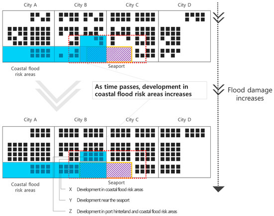 This study established a conceptual model of a coastal city that incorporated the content shown in Figure 1. The conceptual model plots virtual cities (A, B, C, D) over time. This model improves the port–city relationship emphasized by Hoyle [6]. This study presented a model that demonstrated the development that causes flood damage. The paradox of development in risk areas has been established [8], and it was considered in our model. In particular, the conceptual model demonstrates the development of coastal cities over time, especially in risk areas. There are four schematic concepts: port, port hinterland area, city development, and coastal flood risk areas. They reveal that the ports, port hinterlands, and urban development corresponding to the development of coastal cities could occur in coastal flood risk areas. We sought to show that urban development around ports increased in coastal flood risk areas. Over time, permits are provided, and the developments that appear are shown together.