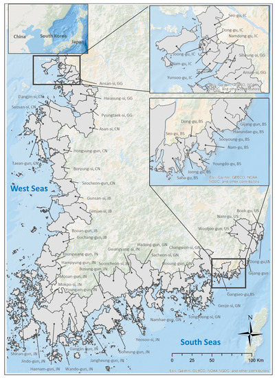 In this study, the unit of analysis is the coastal city. There are 74 cities in Korea, including the coastal cities that are the subjects of this research. The study explored 58 coastal cities in total. The process of selecting coastal cities for the study was as follows: First, 72 cities that need coastal management were selected from the total 74 coastal cities. According to the Coastal Management Act in Korea, erosion control, coastal maintenance, and natural coast management are the key points for coastal management. Two cities in Jeju Island (Jeju-si and Seogwipo-si), which have strong marine characteristics, were excluded, as there was difficulty in obtaining data on flood damage. An additional 14 cities were excluded because there was no coastal flood risk information. As coastal flood is caused by typhoons and heavy rains, coastal flooding projections are mostly available for coastal cities around the West and South Seas. Five cities in Gyeongbuk (Gyeongju-si, Pohang-si, Yeongdeok-gun, Uljin-gun, and Ulleung-gun) and six cities in Gangwon (Gangneung-si, Donghae-si, Sokcho-si, Samcheok-si, Goseong-gun, and Yangyang-gun) do not have coastal inundation forecasts; that is, spatial information that detects the risk of flooding on the coast. A total of 11 cities were therefore excluded from this study. Finally, three cities (Incheon[Ongjin-gun and Ganghwa-gun], Gyungggi[Gimpo-si]), which are located near latitude 38 of South Korea, were also excluded from the coastal flood forecast.