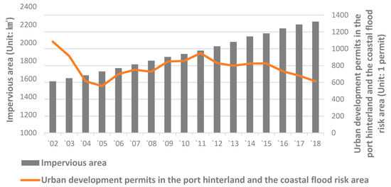 This study mainly addresses city development in the port hinterlands and coastal flood risk areas. The number of buildings within the dotted lines that overlap the coastal flood risk areas (the blue area) doubles from six to twelve. This study assumes that flood damage will increase if development is carried out in coastal cities. In addition, if the impermeable area increases with urban development, flood damage will increase. Accordingly, research questions and hypotheses were established to explore whether flood damage would be affected by an increase of urban development permits in risk areas.