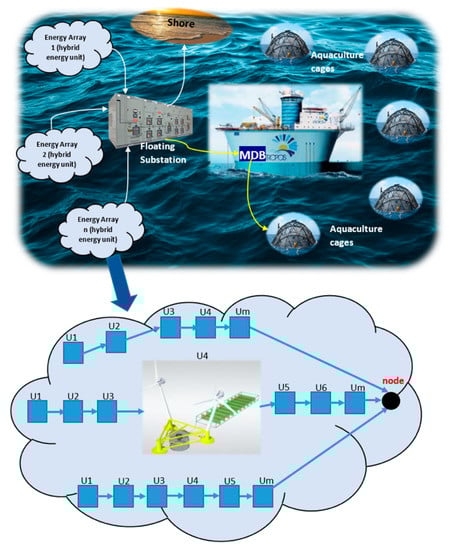 An MUP could be defined as an area of sea or ocean that combines different activities such as aquaculture, tourism, transportation, oil production, and energy farms. The combination of these activities could be completely integrated into one platform (shared structure) or could just share a marine space (shared area); more focus on this comes later in Section 3 [5]. Bringing different activities together could potentially benefit each other by lowering installation and maintenance costs, increasing resource utilization, reducing the environmental impact, etc. [6]. To sum up, an MUP comprises different kinds of renewable energies based on site parameters, in addition to other activities such as aquaculture, maintenance service, and leisure, as shown in Figure 1. The energy array in Figure 1 involves many hybrid energy units because every unit could comprise a wind turbine, a wave converter, and a small solar farm. Figure 1 illustrates the idea of an MUP, and, later, Section 3 shows that there are many other structures with different concepts. One of the ideas of MUPs is to use a floating substation that is separated from the platform that could export energy to the shore or supply onsite loads via a main distribution board (MDB).