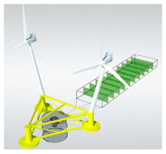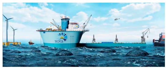 The TROPOS project proposed what is called a floating satellite unit (see Figure 4), which combines wind turbines, PV solar panels, and an aquaculture breeding fish facility with an algae farm attached to it [36].