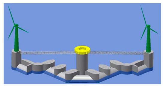 The idea of this structure is highlighted under the MERMAID project. In these structures, different energy converters share the same foundation and connections, and everything is shared as a unit (see Figure 3, Figure 4, Figure 5, Figure 6, Figure 7, Figure 8, Figure 9, Figure 10, Figure 11, Figure 12, Figure 13, Figure 14 and Figure 15). Some loads such as aquaculture and algae farms could be attached to that unit, as proposed in the TROPOS project (Satellite Unit; see Figure 4). The foundation of this structure could be bottom-fixed or floating as per Figure 3a,b, respectively [17].