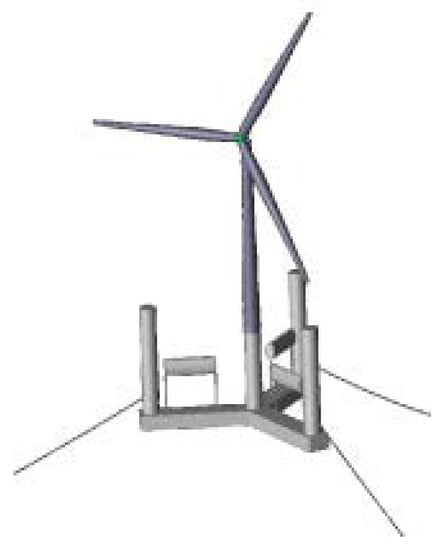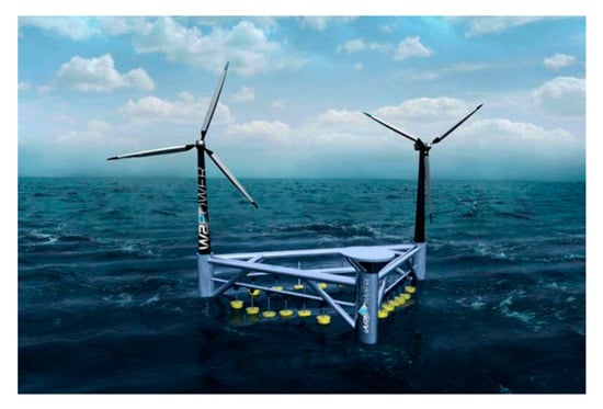 This structure was proposed and developed under the Marina platform project. It has a semi-submersible floating foundation and combines a wind turbine with a wave converter, as shown in Figure 11 [24].
