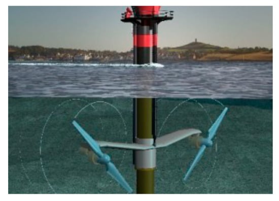 This was developed by the Seagen Company. It has a fixed pile (monopole) and combines a wind turbine with a tidal converter, as shown in Figure 9 [24].