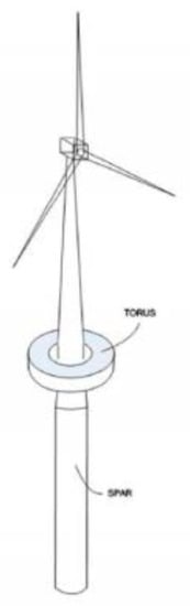 As with the previous two structures, this structure was developed and tested under the Marina platform project. It has a spar floating buoy and combines a wind turbine with a wave converter (point absorber type), as shown in Figure 13 [24].