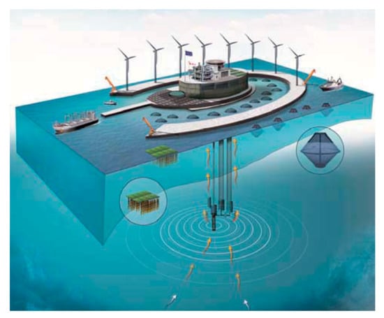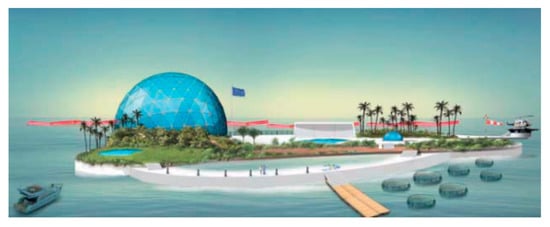 The concept of an island structure is becoming very clear under the TROPOS project via the three proposed island configurations, which are the sustainable service hub island, the green and blue island, and the leisure island. TROPOS has aimed to develop a floating MUP to adapt to deep waters with focus on Mediterranean, tropical and sub-tropical areas [37]. Basically, the four main sectors to be integrated into these islands are those of transport, energy, aquaculture and leisure (TEAL). For more information on two kinds of islands—artificial and floating islands—interested readers can look at [17].