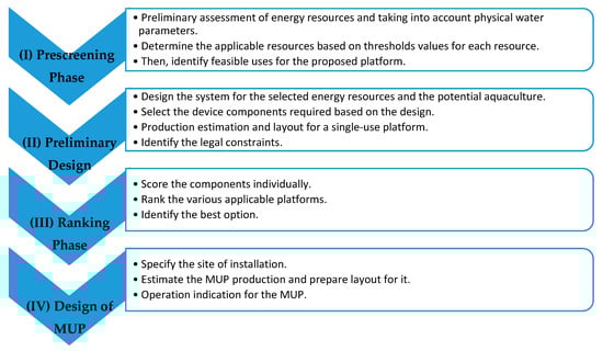 Designing offshore platform requires the assessment of the project site from different sides: technical, economic, social and environmental. Thus, involving all relevant stakeholders at an early stage of development is required because the design of such installations depends on experts’ judgement from different sectors. Barbara et al. [44] proposed a methodology consisting of four phases for the purpose of design of an offshore platform: the pre-screening phase, the preliminary design of the single-use platform, the ranking phase, and, lastly, the preliminary design for the selected multi-use platform, as shown in Figure 19.