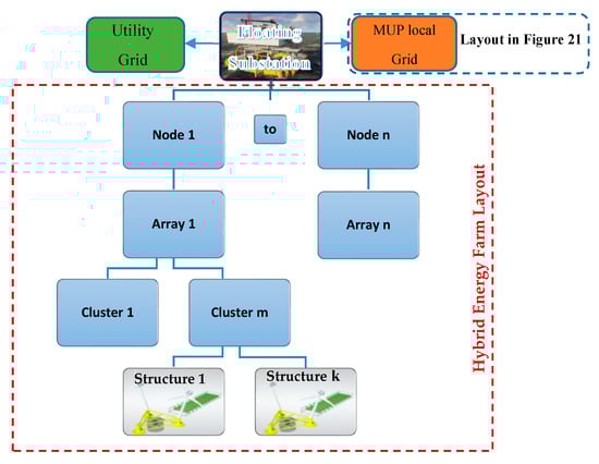 This section highlights the electrical connection between different components of an offshore platform. It is important to differentiate between two different electrical layouts: the hybrid energy resources layout and the MUP local grid layout. Hybrid energy resources represent the generation station or the supply to the MUP local grid. This supply depends on different marine energies, as presented in Section 3, of the combined structures. To the authors’ knowledge, the electrical connection between such structures has not been reported in the literature of MUPs. For this reason, this paper proposes the layout of wind energy farms to be applied for hybrid energy resources that considers a structure as one unit, as shown in Figure 20. A cluster within the wind farm could include n wind turbines, but under this study, it combines n structures when a structure could have various turbines. Figure 20 shows the connection levels, starting from the structure level, through the cluster and array level, to the node level, and ending with the substation level. A substation could supply the offshore platform or export energy, after adding extra equipment, to the shore in the case of large-scale energy farms.