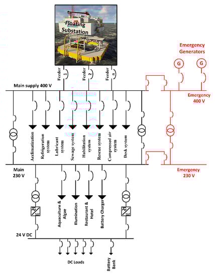 An offshore MUP local network has been explored under the TROPOS project for the three different island configurations presented in Section 3.3. Two Alternating Current (AC) low voltage levels have been introduced: 400 VAC, which supply loads for sections such as those of acclimatization, a refrigeration system, a lubricant system, a sewage system and a rescue system, and 230 VAC, which supplies sections such as those of the aquaculture and algae systems, illumination, restaurant, hotel, and battery charger, in addition to a 24 VDC line for DC loads (see Figure 21). The daily load profile of the three island scenarios is provided in [36].