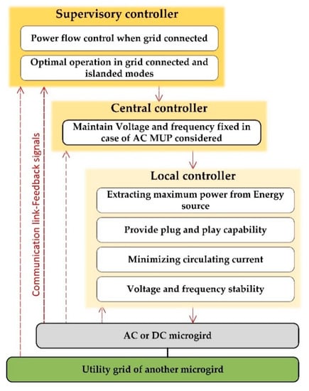 Some studies [46,47,48,49] have proposed a hierarchical control strategy with three control levels for controlling a microgrid by considering the islanded mode, the grid-connected mode, or connections with other microgrids; see Figure 22. Hierarchical control includes three control levels: a local controller, a central controller, and a supervisory controller from the lower to higher levels, respectively.