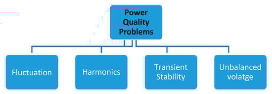Generally speaking, a utility power grid basically depends on very large generator capacities that make it stable even with big disturbances occur. The situation is different with an MUP grid, which depends on many micro-sources to supply its fluctuating power. Due to the individual nature of the offshore grid, one of the challenges it could face is power quality problems. The authors of [50] identified these problems as shown in Figure 23.