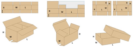So, by defining the box type and the range of external volume (V) available for containing the primary packaging or products, it is feasible to establish the box’s theoretical surface area (S) that can be used in the manufacture of the box (and its waste) as a function of its external dimensions (length, L; width, W; height, H), which together create the volume mentioned.