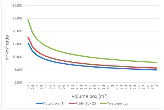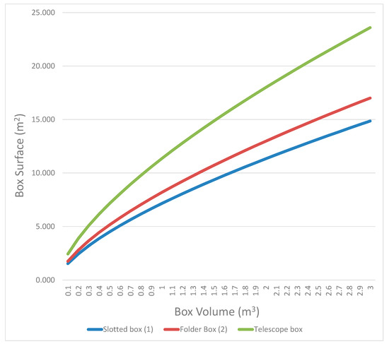 The larger the boxes are in terms of useful volume (for one type), the smaller the relative consumption of cardboard (and waste) per m3 (Figure 3). This is a critical aspect of the proposed model, given that its ultimate aim is to seek solutions that improve the m2/m3 ratio among the feasible solutions on the graph (ideally, the optimum one). This makes it possible to move towards consuming relatively less cardboard (and creating less associated waste). Nevertheless, using bigger packaging can have negative impacts in terms of ease of packing, handling, stock levels or adaptation to consumer needs.