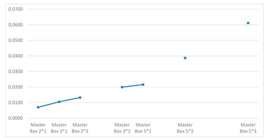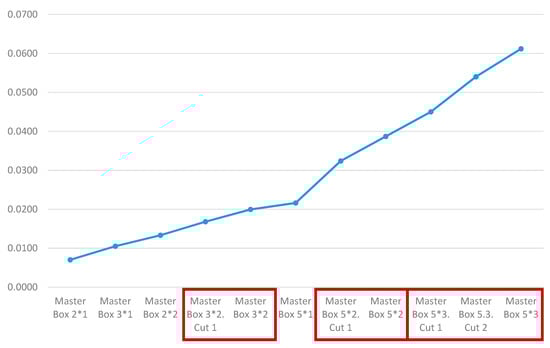 The proposed solution was to maintain the number of master boxes and use die cutting to make the height variable in 3 boxes (3 × 2; 5 × 2; 5 × 3) (see Table 7). This meant that the volume of these boxes could be deployed in two ways—the original box and a cut-down one created by cutting the box in the die-cut area—adapting it in a better way to the orders (see Figure 5). This was all achieved without increasing the number of master box formats and, therefore, without losing economies of scale when buying. Comparatively, consumption of boxes in distribution was reduced (lower buying costs and lower transport costs associated with the number of items).