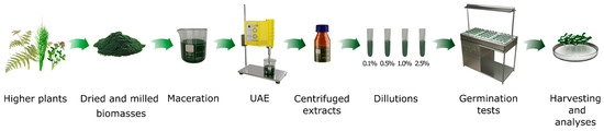 To investigate the impact of produced extracts on the white head cabbage growth, the screening tests under controlled conditions (germination tests) were conducted. These studies indicate also the potential phytotoxicity of the tested extracts. The general scheme of experiments is presented in Figure 1.