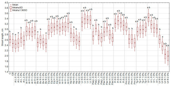 The shoot length of white head cabbage seedlings after application of plant extracts. (a) Statistically significant differences (p < 0.05) between the control group (C) and extracts. (b) Statistically significant differences (p < 0.05) between commercial biostimulant (CB) and extracts. Abbreviations: Al L, Aloë vera L. Burm. f. (leaf); Ar Fr, Aronia melanocarpa (Michx) Elliott (fruit); Bv R, Beta vulgaris L. (root); Eq H, Equisetum arvense L. (herb); Hr Fr, Hippophae rhamnoides L. (fruit); Hp H, Hypericum perforatum L. (herb); Lc S, Lens culinaris Medik.(seeds); Paq L, Pteridium aquilinum L.) (leaf); Pav L, Polygonum aviculare L. (herb); Pi S, Pisum sativum L. (seeds); Pm H, Plantago major L. (herb); Tp F, Trifolium pratense L. (flower); Ur L, Urtica dioica L. (leaf); Ur R, Urtica dioica L. (root).