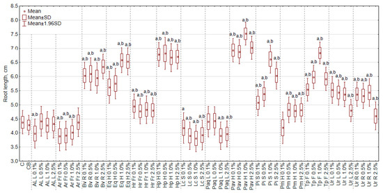 The effect of plant extracts on the length of shoots and roots of white head cabbage seedlings is presented in Figure 2 and Figure 3, respectively. Almost all tested extracts positively influenced the mean root length, including red beet (Bv R), horsetail (Eq H), common sea–buckthorn (Hr Fr), hypericum (Hp H), knotgrass (Pav H), pea (Pi S), broadleaf plantain (Pm H, beside concentration 0.1%), red clover (Tp F), nettle root and leaf (Ur R, Ur L). The values of root length were higher than in the control group. A weaker effect was observed for extracts produced from aloe (Al L), chokeberry (Ar Fr), red lentil (Lc S) and common bracken (Paq L). The concentration of plant extracts had no significant effect (beside horsetail (Eq H), pea (Pi S) and red clover (Tp F)) on the mean root length.