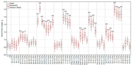 Considering the concentration of plant extracts, 0.1% was the best for extracts produced from chokeberry (Ar Fr), pea (Pi S), common bracken (Paq L), red lentil (Lc S), red clover (Tp F) and nettle (Ur L). Concentration 0.5% dominated only for horsetail (Eq H), whereas 1.0% for extracts from red beet (Bv R), hypericum (Hp H), knotgrass (Pav H), broadleaf plantain (Pm H) and common nettle (Ur R). The highest concentration 2.5% provided the highest mean fresh weight of shoots for extracts from aloe (Al L) and common sea–buckthorn (Hr Fr). This confirms one of the properties of plant growth biostimulants, that they are especially active at low concentrations. Based on these data, the dose 0.1% can be selected for further testing.
