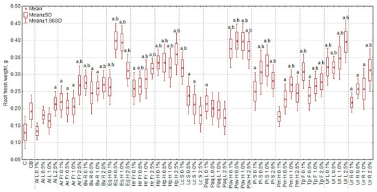 There is no clear relationship between the root fresh weight and the concentration of plant extracts. 0.1% increased the fresh weight of cabbage seedlings after application of extracts from red beet (Bv R), red lentil (Lc S), common bracken (Paq L), red clover (Tp F), 0.5% for extracts from horsetail (Eq H) and knotgrass (Pav H), 1.0% for extracts from pea (Pi S) and broadleaf plantain (Pm H), and finally 2.5% for extracts from aloe (Al L), chokeberry (Ar Fr), common sea–buckthorn (Hr Fr), hypericum (Hp H), nettle leaf (Ur L) and nettle root (Ur R). Among tested extracts and their concentrations, 2.5% occurred the most often.