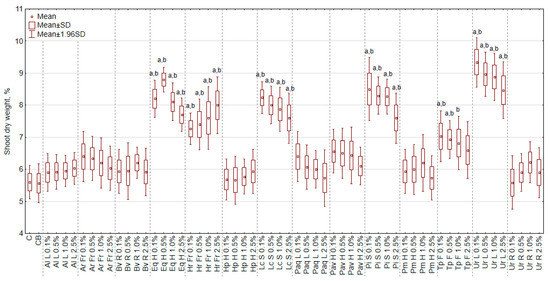 All tested extracts in all concentrations (with exception of only nettle – root 0.1%) provided higher dry weight of cabbage shoots than both control groups (Figure 6). Statistically significant differences were observed between dry weight in the control group and the following extracts: horsetail (Eq H), common sea buckthorn (Hr Fr), red lentil (Lc S), pea (Pi S), red clover (Tp F) and common nettle (Ur L).