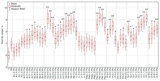 Taking into account the concentration of the examined plant extracts, 0.1% was the best for red beet (Bv R), red lentil (Lc S), common bracken (Paq L), red clover (Tp F)—for these extracts, dry weight of roots decreases with the increase of extract concentration. In the case of 0.5% extracts, significant effect was observed for the following biomasses - horsetail (Eq H), knotgrass (Pav H) and broadleaf plantain (Pm H). 1.0% concentration was the best for extracts produced from pea (Pi S) and broadleaf plantain (Pm H), whereas the highest concentration of extracts—2.5% for aloe (Al L), chokeberry (Ar Fr), common sea–buckthorn (Hr Fr), hypericum (Hp H), nettle (Ur L and Ur R). For this concentration with the increase of extract concentration, dry weight of roots increases. Similarly, as for fresh weight of roots (Figure 5), the concentration 2.5% occurred the most often and can be recommended for further research.