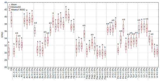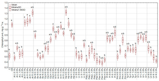 In general, chlorophyll content in the cabbage seedlings was higher in the tested groups than in the control group with water, beside aloe (Al L, 0.1%), red beet (Bv R, 1.0 and 2.5%), red lentil (Lc S, 0.5 and 1.0%), common bracken (Paq L, 0.1%), knotgrass (Pav H, all concentrations), broadleaf plantain (Pm H, 0.1%) and nettle (Ur R, 1.0% and 2.5%) (Figure 8). But in the case of commercial biostimulant, higher contents of chlorophyll were observed in plants treated with extracts only from chokeberry (Ar Fr, all concentrations) and hypericum (Hp H, 0.1% and 0.5%). The best results were obtained for hypericum (Hp H, 0.1%)—the chlorophyll content was higher about 2.5 times than in the control group with water and higher by 22% than for commercial biostimulant. For chokeberry (Ar Fr, 2.5%), these values were as follows—about 2.5 times higher and 20% higher, respectively.