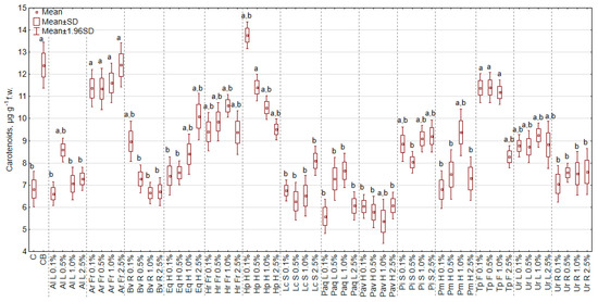 The content of carotenoids of white head cabbage seedlings after application of plant extracts. (a) Statistically significant differences (p < 0.05) between the control group (C) and extracts. (b) Statistically significant differences (p < 0.05) between commercial biostimulant (CB) and extracts. Abbreviations as in Figure 2.