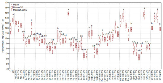 Most of the examined plant extracts didn’t influence positively the polyphenols content (Figure 11). In most tested groups, it was lower than in the control groups—C and CB. Higher values of polyphenols, than in the group with commercial biostimulant, were observed only for hypericum (Hp H, 0.1%), broadleaf plantain (Pm H, 0.5%), nettle (Ur L, 0.5%) and nettle (Ur R, 0.5% and 1.0%). The best experimental group was extract from hypericum (Hp H, 0.1%), where the mean polyphenol content was higher by 25% than in the control group with water and by 9% than in the group with commercial biostimulant. Extracts from aloe (Al L, 0.1%, 0.5%, and 1.0%) increased the content of polyphenols in cabbage seedlings in comparison with the control group with water.
