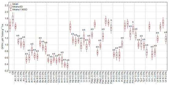 The antioxidant activity (DPPH) of white head cabbage seedlings after application of plant extracts. (a) Statistically significant differences (p < 0.05) between the control group (C) and extracts. (b) Statistically significant differences (p < 0.05) between commercial biostimulant (CB) and extracts. Abbreviations as in Figure 2.