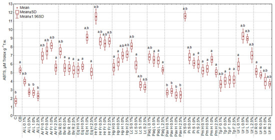 Obtained results showed a statistically significant influence of the tested botanical extracts on the growth, composition and antioxidant activity of cabbage seedlings. The effect of produced biostimulants was compared with the control groups (C and CB) examined in our previous work [71].