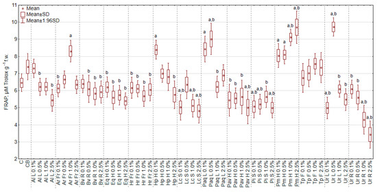 Most of the plant extracts showed lower antioxidant activity, measured by FRAP assay (Figure 14), than examined control groups: C and CB, which coincides with the results presented in Figure 12 (DPPH). Higher values of antioxidant activity of cabbage seedlings than for commercial biostimulant were observed for the following plant extracts: chokeberry (Ar Fr, 1.0%), hypericum (Hp H, 0.1%), common bracken (Paq L, 0.1% and 0.5%), broadleaf plantain (Pm H, all concentrations), red clover (Tp F, 1.0%) and nettle (Ur L, 0.5%). The best results were obtained for broadleaf plantain (Pm H) applied at concentration 2.5%: which was by 50% higher than in the control group with water and by 31% than in the control group with commercial biostimulant. In addition, higher antioxidant activity of cabbage seedlings than in the control group with water group was determined for the extracts—aloe (Al L, 0.1%), chokeberry (Ar Fr, 0.5%), hypericum (Hp H, 0.5 and 1.0 %), common bracken (Paq L, 2.5%) and red clover (Tp F, 0.1%, 0.5%, and 2.5%) (almost the same groups like for the commercial biostimulant).