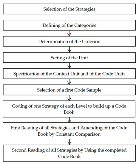 After the completion of the first reading, a second reading had to be carried out with the complete list of 114 codes found in the texts and summarized in the master table so that the codes added later were used equally in all documents. All newly added codes during the second reading were highlighted in a different color to more easily identify where sections in strategies were newly marked and where additions were made.