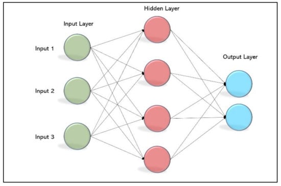 The first machine learning technique used in this work was the ANN, which is a computing system that is designed to mimic the way the biological systems, such as the human or animal brains, behave. ANN is developed to identify, estimate, classify, or make a decision by using a machine program. ANN is available in different structures; the simplest ANN structure, which was used in this study, is called multi-layered perceptron (MLP) which consists of one input layer, one or several hidden (learning) layers, and one output layer, as shown in Figure 1 []. The ANN systems are trained originally using training data (supervised learning) to perform the needed tasks [].