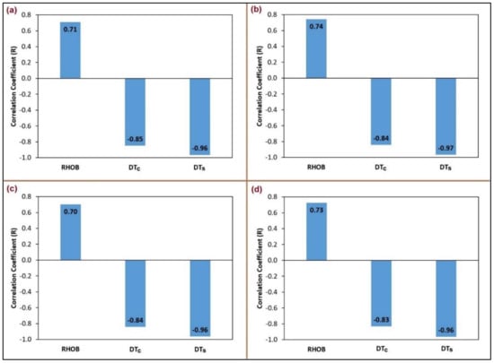 The input training well logs data were selected based on their relative importance on the actual Estatic which was determined in this study based on the correlation coefficient (R), Figure 3 compares R for the input well log data used to train the different machine learning model. As indicated in Figure 3, all well log parameters used to train the machine learning models are strongly related to Estatic with high Rs of >0.7 for the bulk density, >0.8 for the compressional transit time, and >0.95 for the shear transit time.