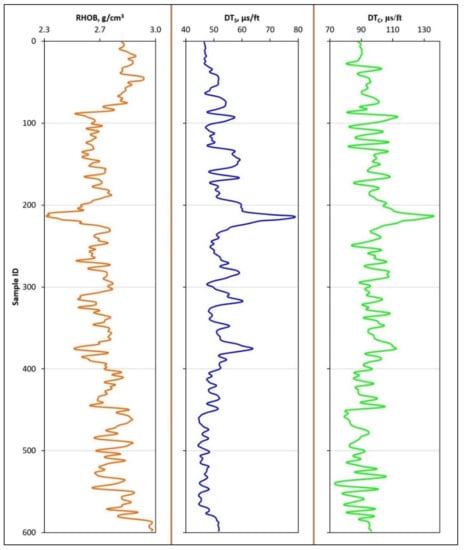 Prediction of the mechanical characteristics of the reservoir formations, such as Young’s modulus (E), is necessary for the evaluation of the wellbore stability, reservoir compaction, hydraulic fracturing, and formation control []. E is a mechanical parameter that gives an indication of the resistance of the rock samples when exposed to a uniaxial load []. On the other hand, static Young’s modulus (Estatic) is a critical parameter needed to build the earth geomechanical model []. It is also used for fractures’ designing and mapping [,]. While drilling hydrocarbon wells, Estatic is also needed with other mechanical and petrophysical properties to make a full description of the in-situ stresses to ensure wellbore stability [].